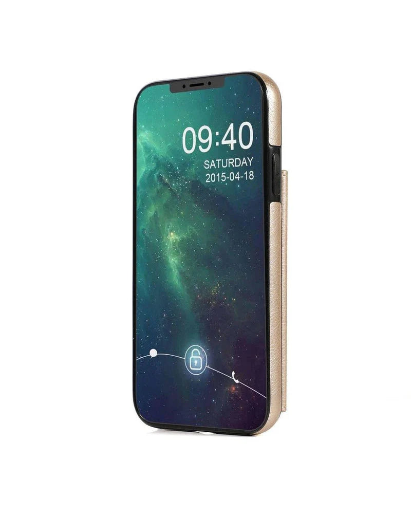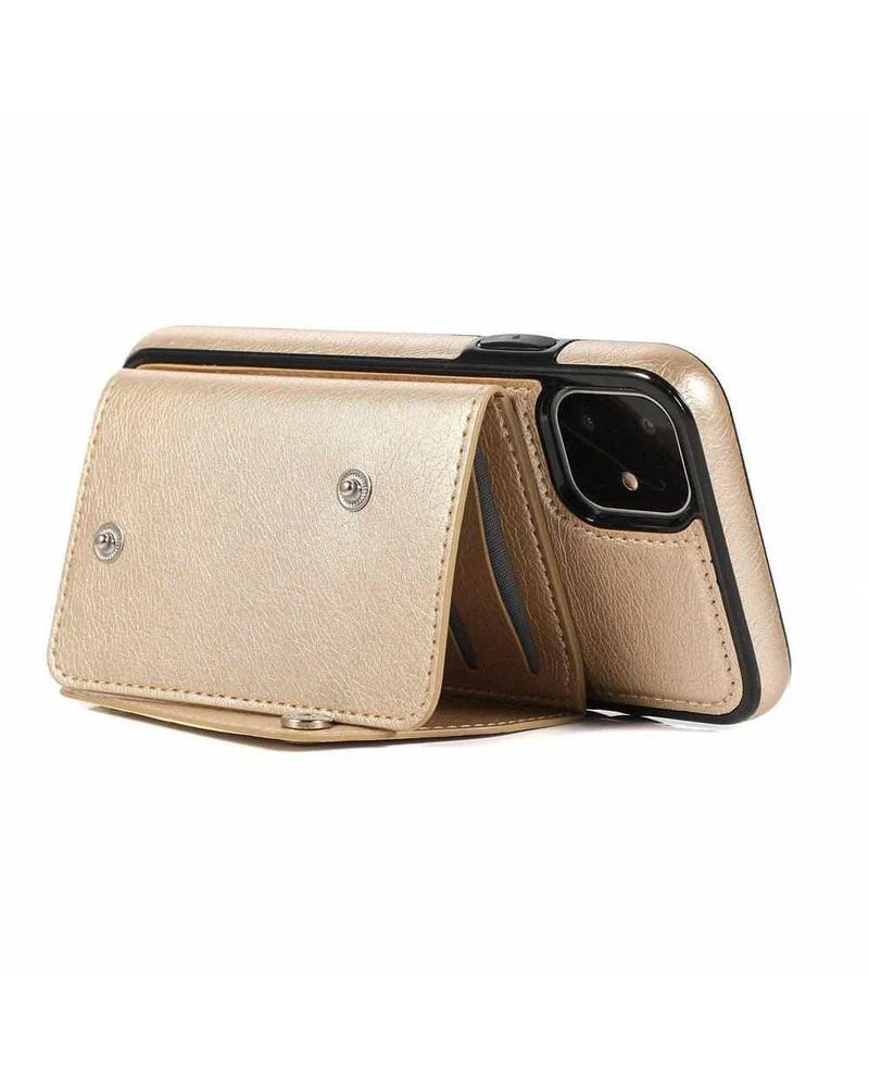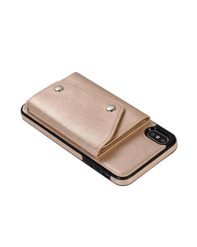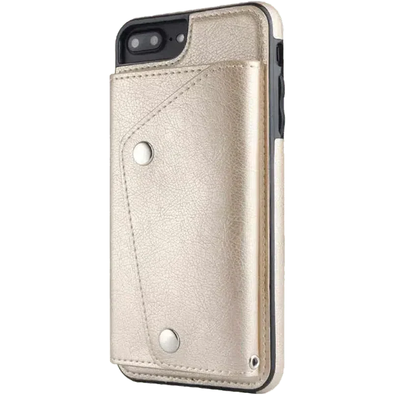 another style within 30 days of receiving your order.For any gal on the go, the Gold Vegan Leather Wallet Case is an absolute necessity. The classic gold faux leather presents a sturdy and protective case in a pretty package. The case opens up to present six slots for cards and another place to slide in cash or cards. The clear slot option is a great place to store your ID before a wild night out - you’ll have everything you need in one spot! On top of that, the case has a removable wristlet attachment, so you can leave the purse behind and have everything dangling in one easy to carry case. With a two-button enclosure, the case will securely snap shut to prevent anything in the wallet from falling out. Unlike some other wallet cases, the camera isn’t obstructed on the Gold Leather Wallet Case so you’ll still be able to snap selfies all night. If gold isn’t your go-to, this awesome case comes in four other colors! (Or you could just get one of each – no judgment here!)