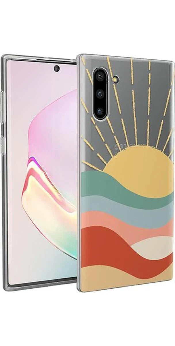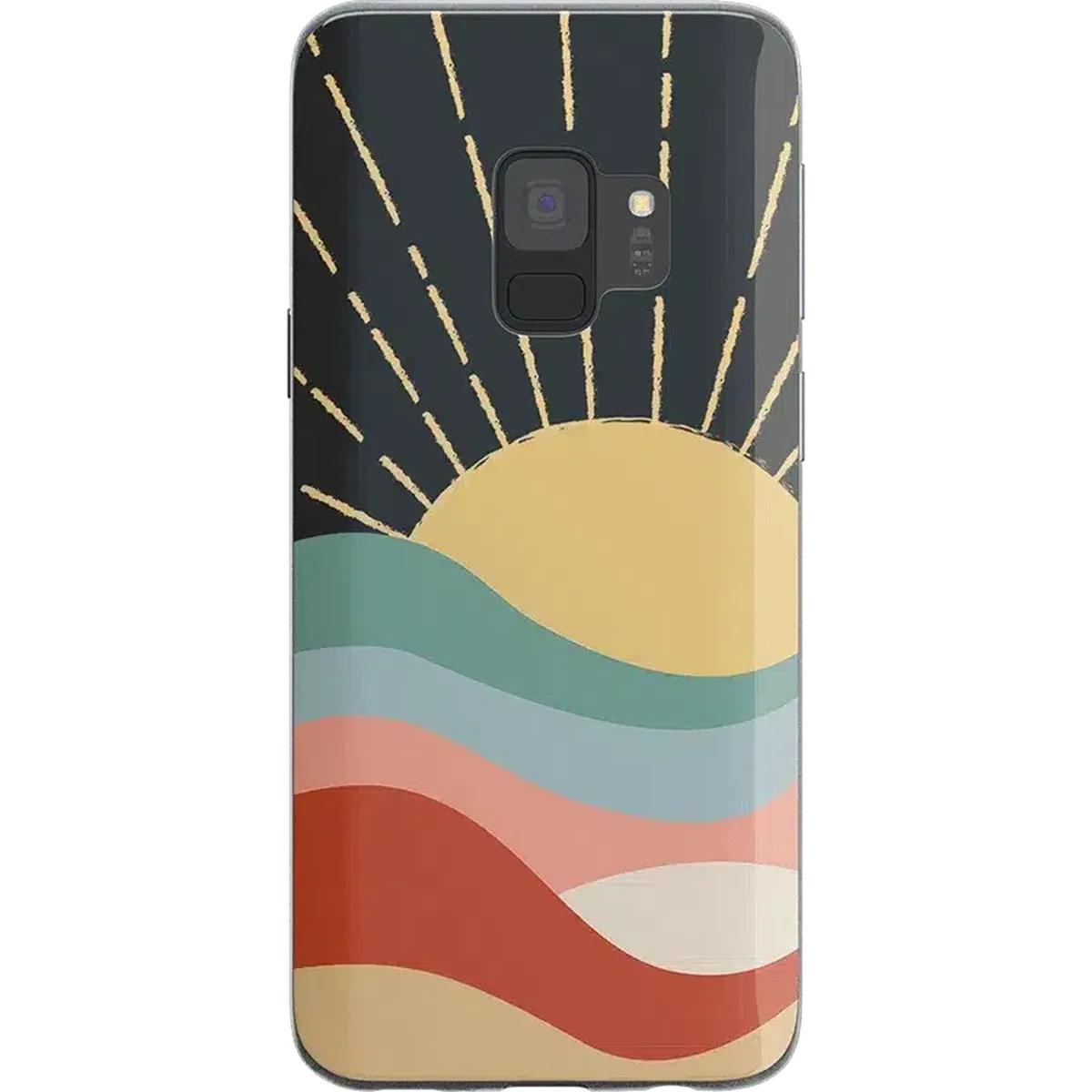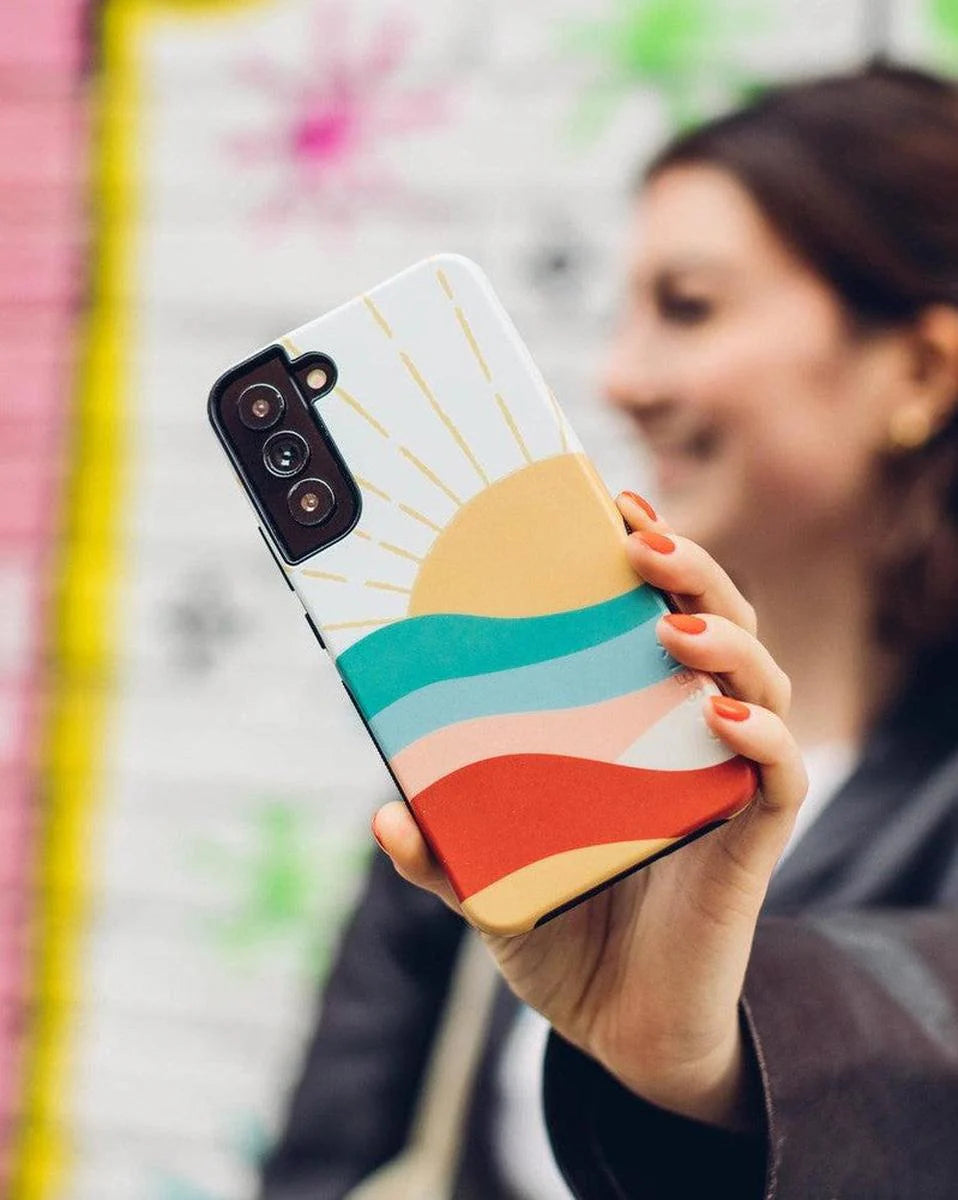 The design features a golden sun at the top with beams shooting upward over a multi-layered landscape. Each layer of the landscape features a different color, from a cool teal to a warm reddish-brown. At first, this amount of color may sound overbearing, but the pale tones all mix together for a satisfying display that we're certain you’ll love. Give your phone the protection and style it deserves with this colorful phone case.