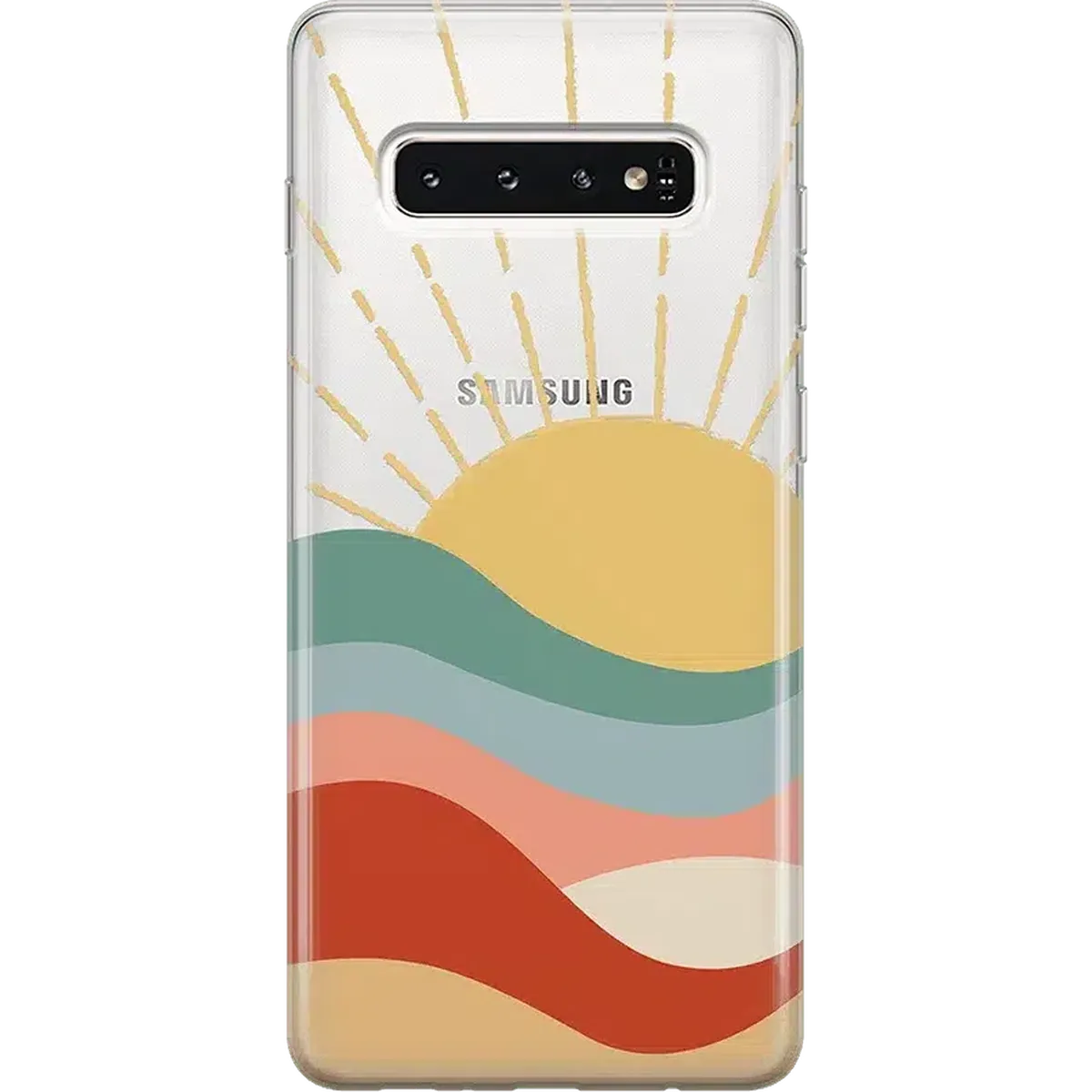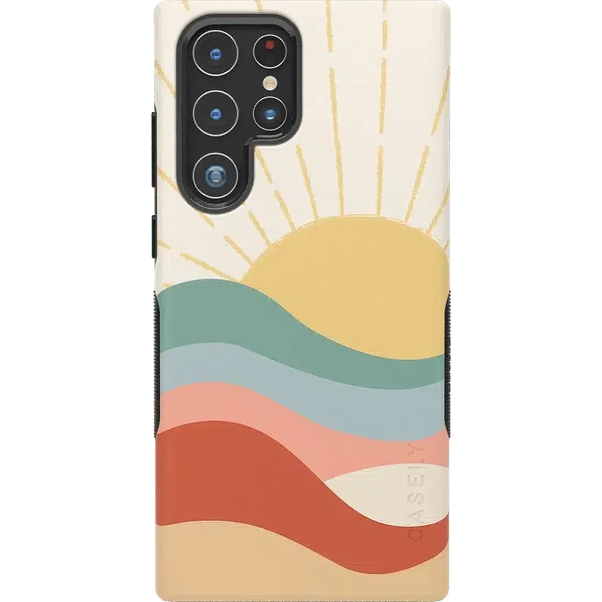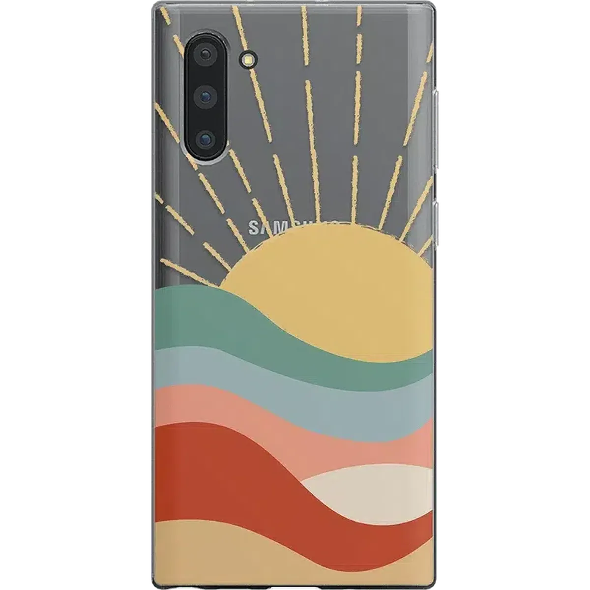 The design features a golden sun at the top with beams shooting upward over a multi-layered landscape. Each layer of the landscape features a different color, from a cool teal to a warm reddish-brown. At first, this amount of color may sound overbearing, but the pale tones all mix together for a satisfying display that we're certain you’ll love. Give your phone the protection and style it deserves with this colorful phone case.