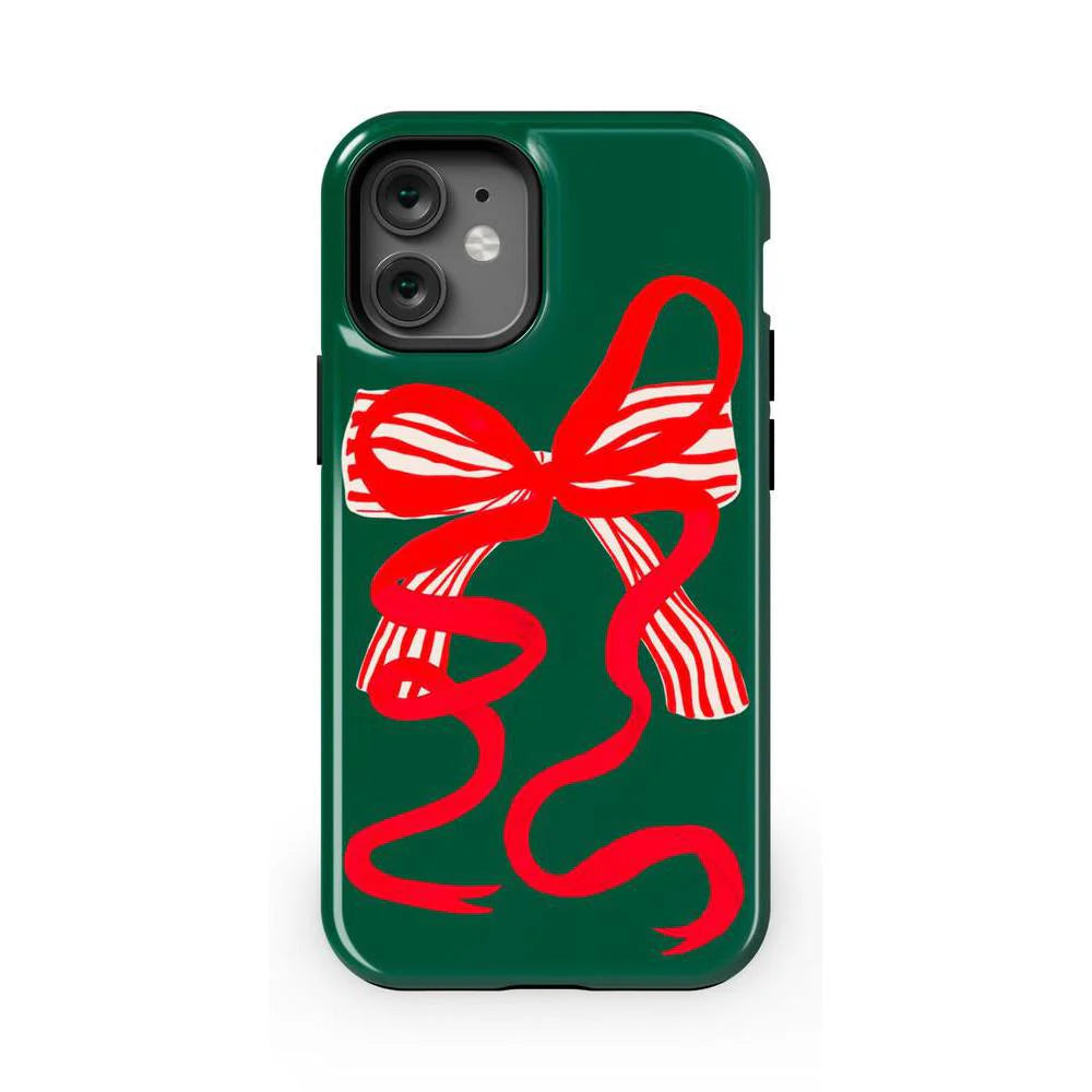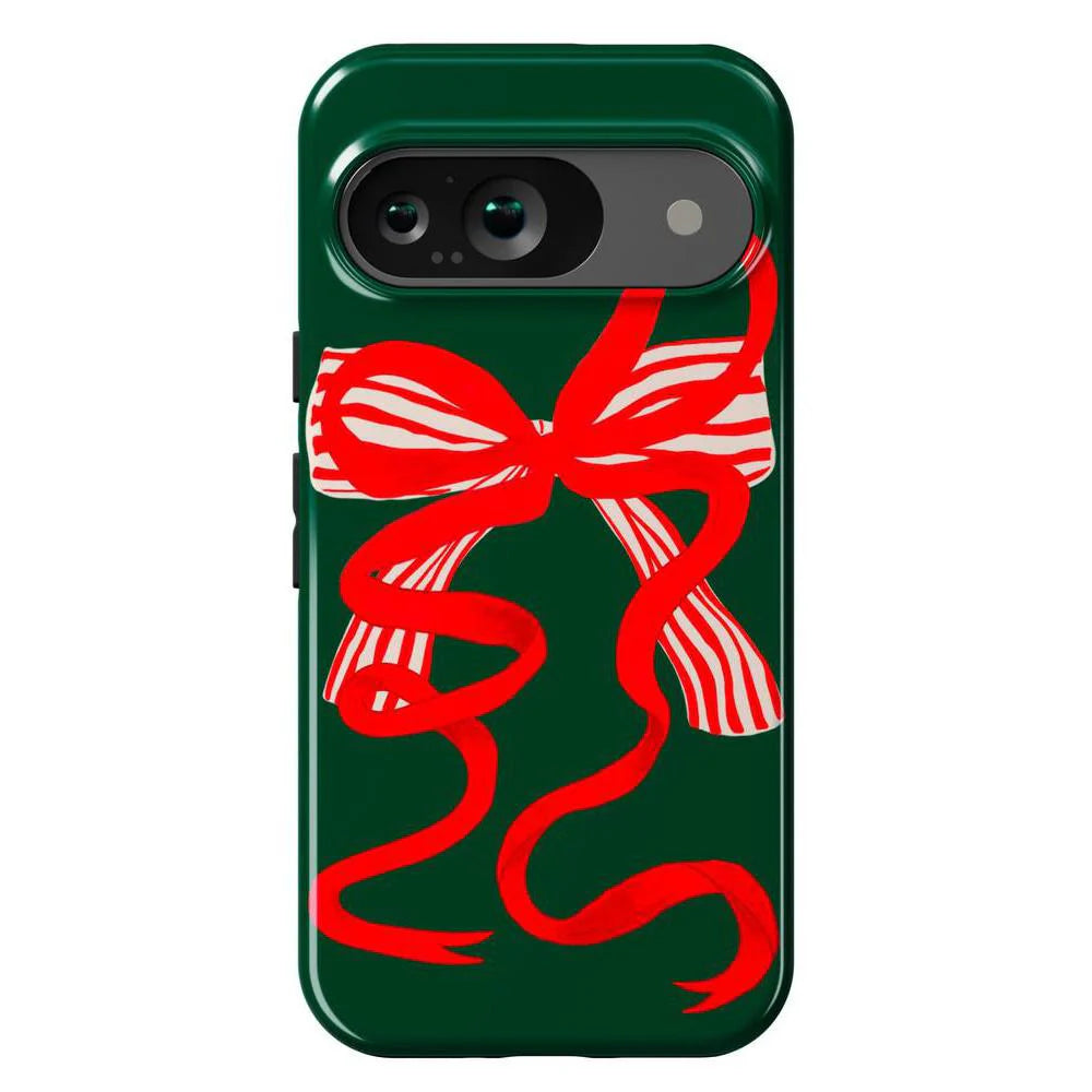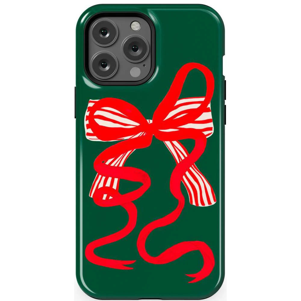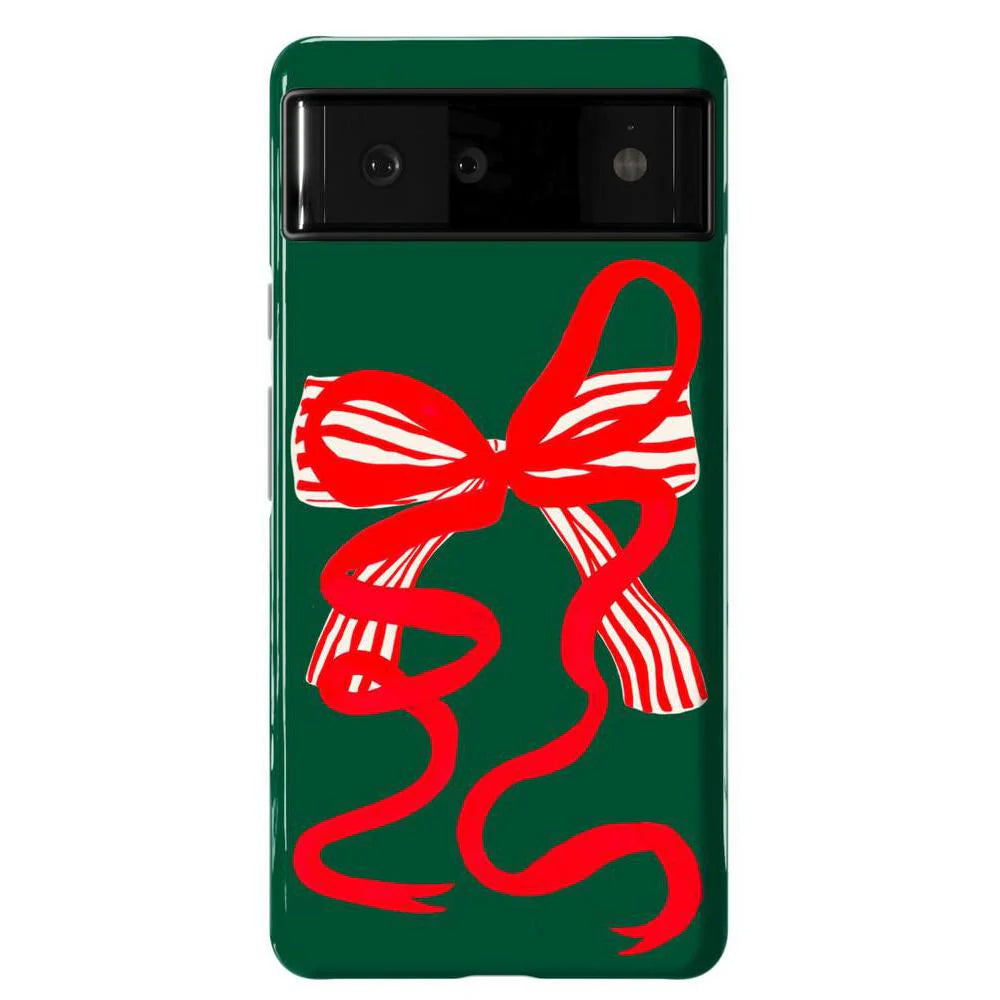 another style within 30 days of receiving your order.Deck your phone out in holiday cheer with the Santa's Favorite Holiday Bow Case, a standout piece from our holiday collection. This case showcases a bold, red holiday bow with a charming striped detail, set against a deep green background that captures the essence of the season. Designed to fit Google Pixel, Samsung Galaxy, and iPhone models, it’s the ideal way to celebrate the holidays in style while keeping your device safe.