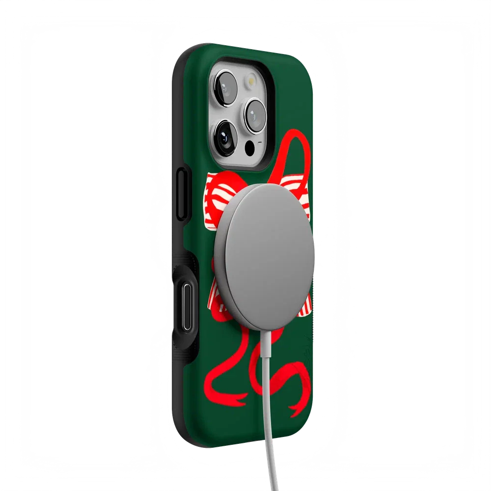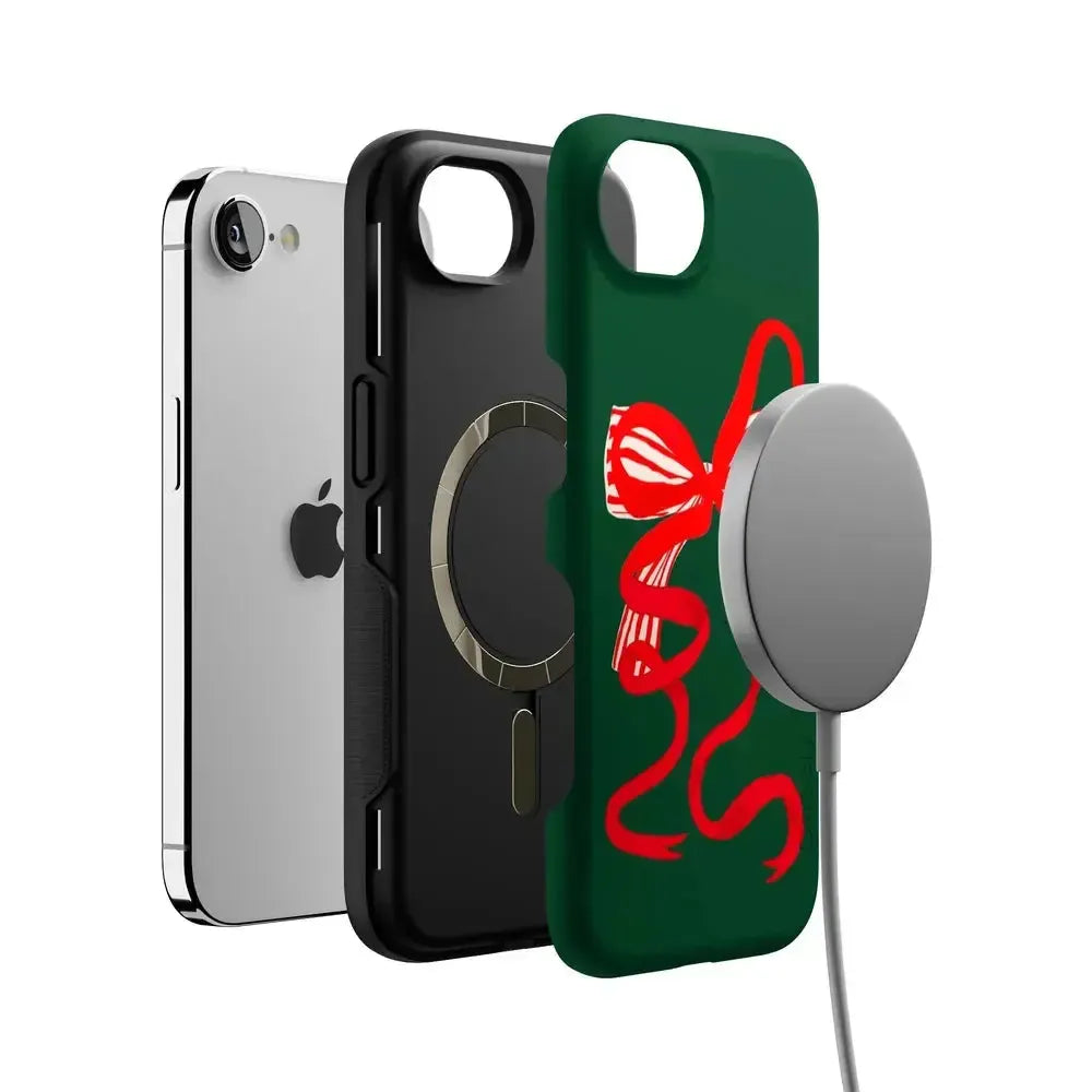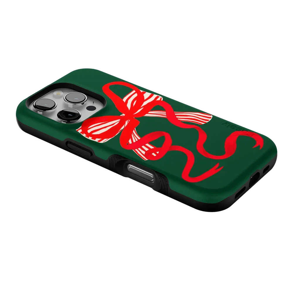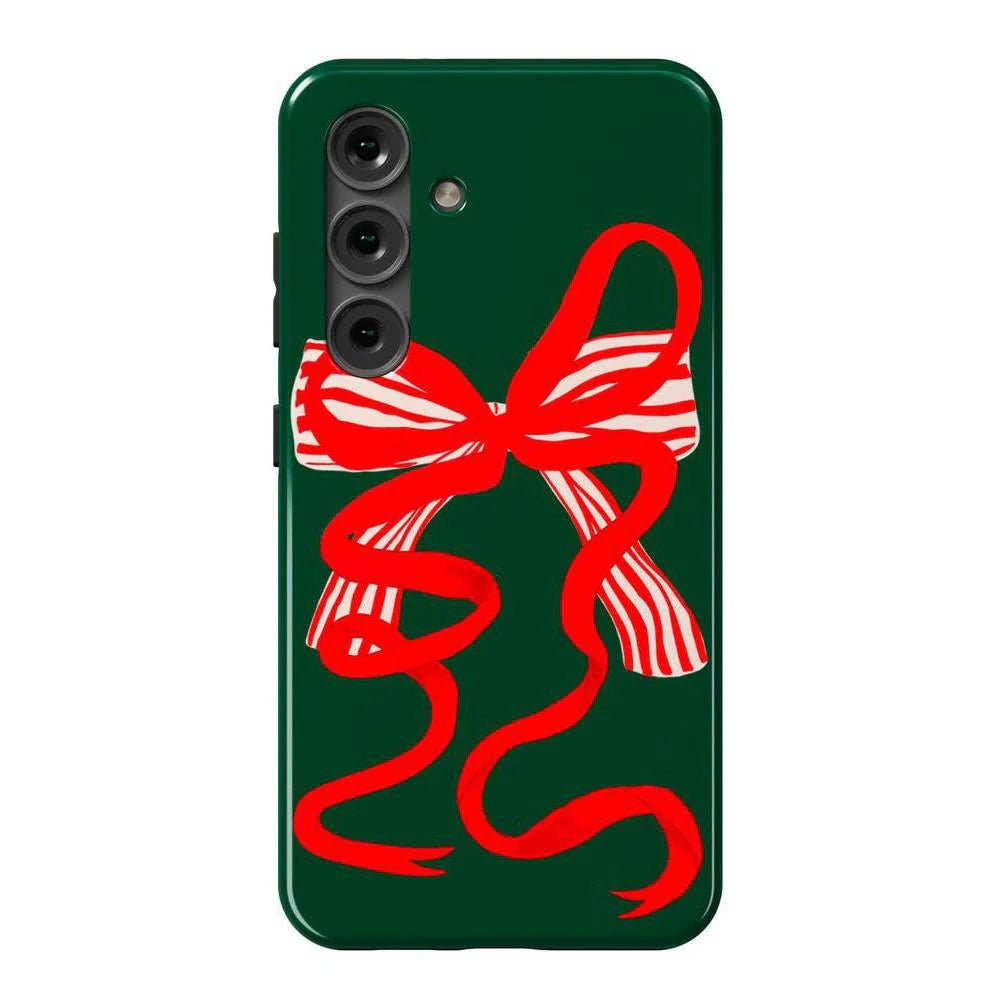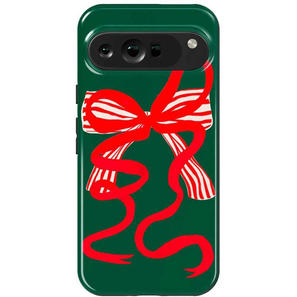 another style within 30 days of receiving your order.Deck your phone out in holiday cheer with the Santa's Favorite Holiday Bow Case, a standout piece from our holiday collection. This case showcases a bold, red holiday bow with a charming striped detail, set against a deep green background that captures the essence of the season. Designed to fit Google Pixel, Samsung Galaxy, and iPhone models, it’s the ideal way to celebrate the holidays in style while keeping your device safe.